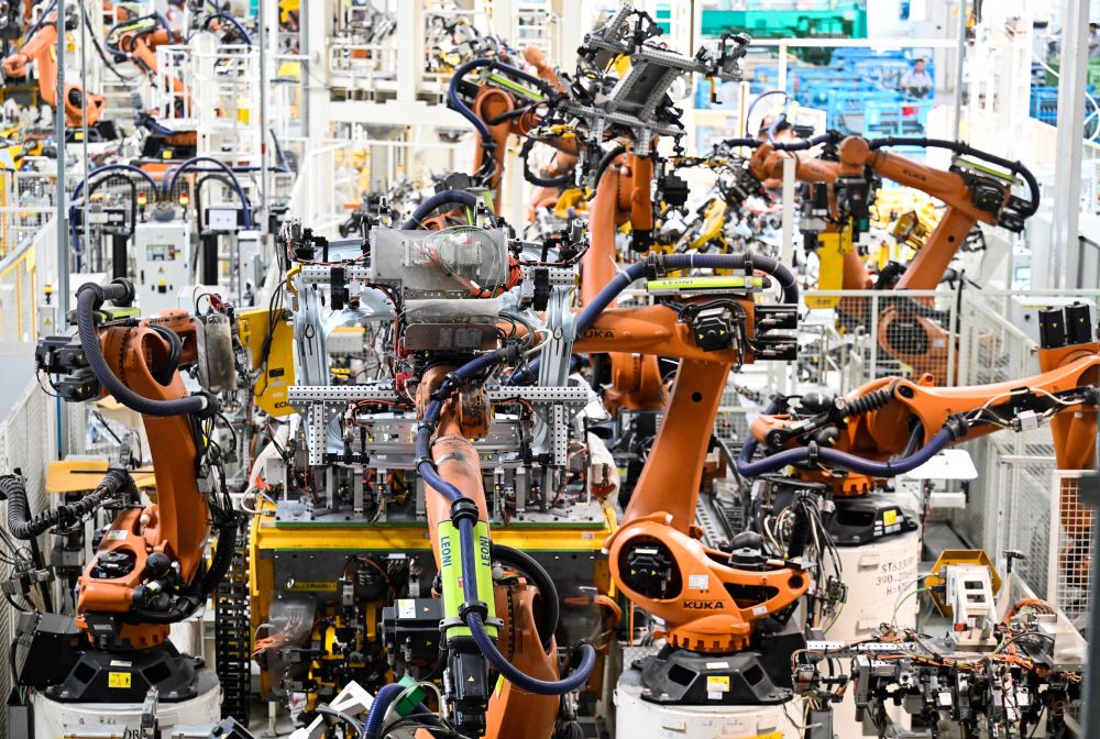 7月7日,機(jī)械臂等自動(dòng)化生產(chǎn)設(shè)備在天津經(jīng)濟(jì)技術(shù)開發(fā)區(qū)一汽-大眾華北基地焊裝車間作業(yè)。新華社記者趙子碩 攝