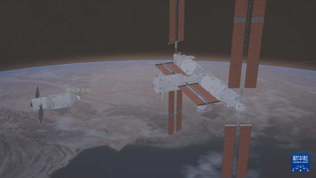 7月15日在北京航天飛行控制中心拍攝的天舟九號貨運(yùn)飛船向空間站組合體靠攏的畫面。新華社發(fā)(周柯毅 攝)