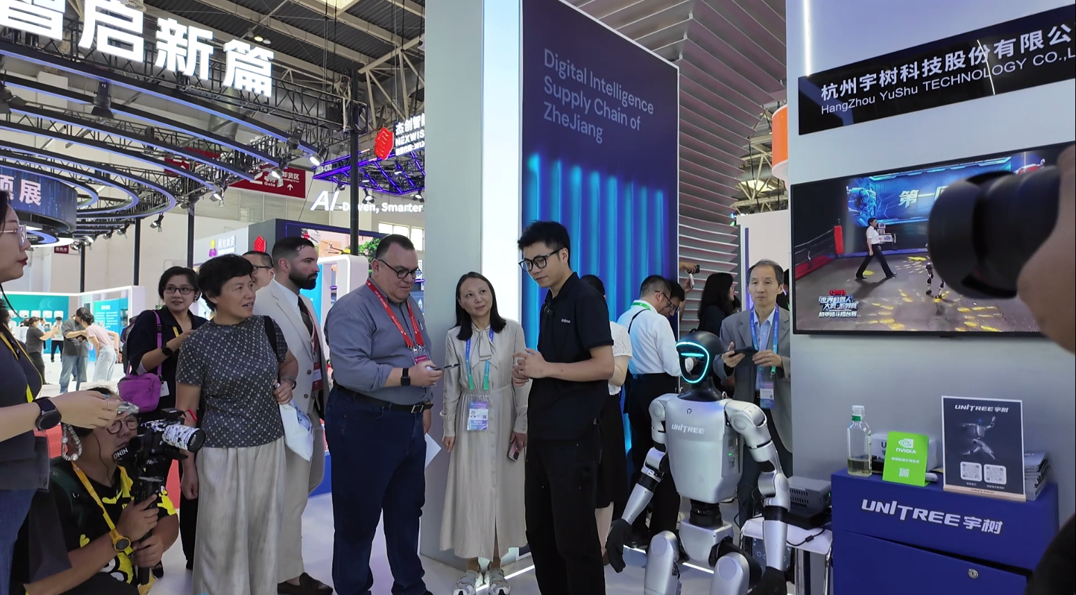 “創(chuàng)新味”還體現(xiàn)在機器人的身影多了。在英偉達展臺、湖北人形機器人展區(qū),以及參與浙江“數(shù)智潮涌 龍躍浙里”主題專區(qū)的宇樹科技和強腦科技展臺,靈巧手、機器狗、工業(yè)機器人、人形機器人等產(chǎn)品吸引著不少中外觀眾上前互動體驗。