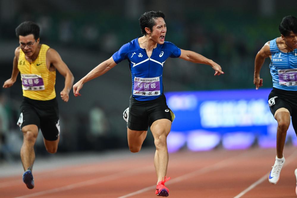 男子100米半決賽也進行得異常激烈,名將謝震業(yè)因為在小組中排名第四,甚至沒能闖入決賽。兩小時之后的決賽中,半決賽排名第一的廣西隊選手鄧信銳以10秒06的個人最好成績奪冠,成為史上第七位突破10秒10的中國隊運動員。