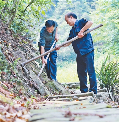 每次上山修路,陳興海和弟弟陳興合都會帶上鐵鍬、鎬頭、鋤頭、斧頭?!笆^硬得很,我一鎬頭下去,手震得疼!”這樣的日子,兄弟倆一過就是8年??傞L約15公里的古道,已經(jīng)修好了約2/3。“我們還要繼續(xù)往下修。”陳興海說。