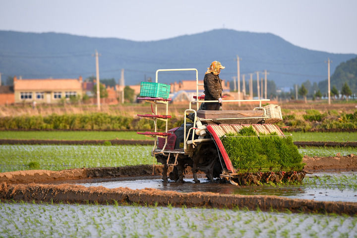 在吉林省吉林市永吉縣鑫豐種植農(nóng)民專業(yè)合作社,農(nóng)民駕駛農(nóng)機(jī)進(jìn)行水稻插秧(2025年5月26日攝)。新華社記者 張楠 攝
