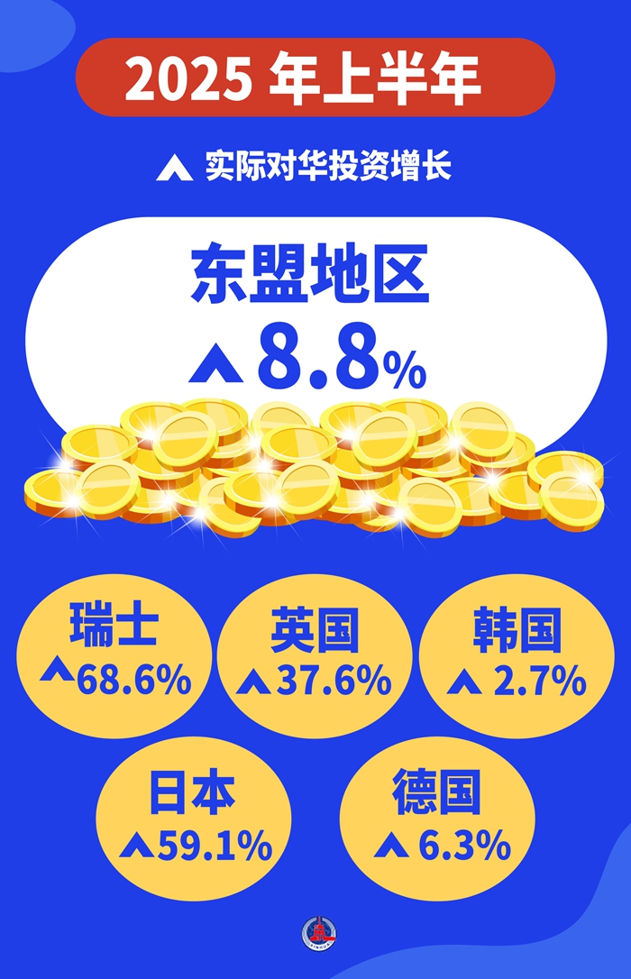 開(kāi)放合作是歷史潮流,互利共贏是人心所向。今年上半年,東盟地區(qū)實(shí)際對(duì)華投資增長(zhǎng)8.8%,瑞士、日本、英國(guó)、德國(guó)、韓國(guó)實(shí)際對(duì)華投資分別增長(zhǎng)68.6%、59.1%、37.6%、6.3%、2.7%。