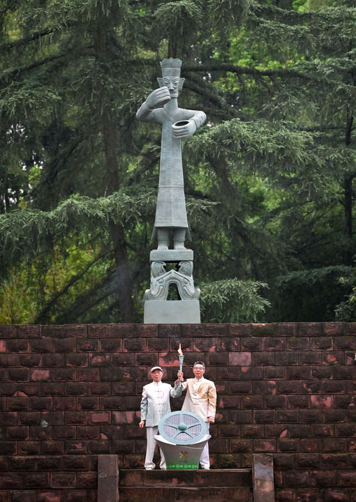 2025年7月26日,三星堆博物館代表肖先進(jìn)(左)、金沙遺址博物館代表朱章義在火種采集儀式上展示火種。當(dāng)日,第十二屆世界運(yùn)動(dòng)會(huì)火炬?zhèn)鬟f活動(dòng)在四川舉行。