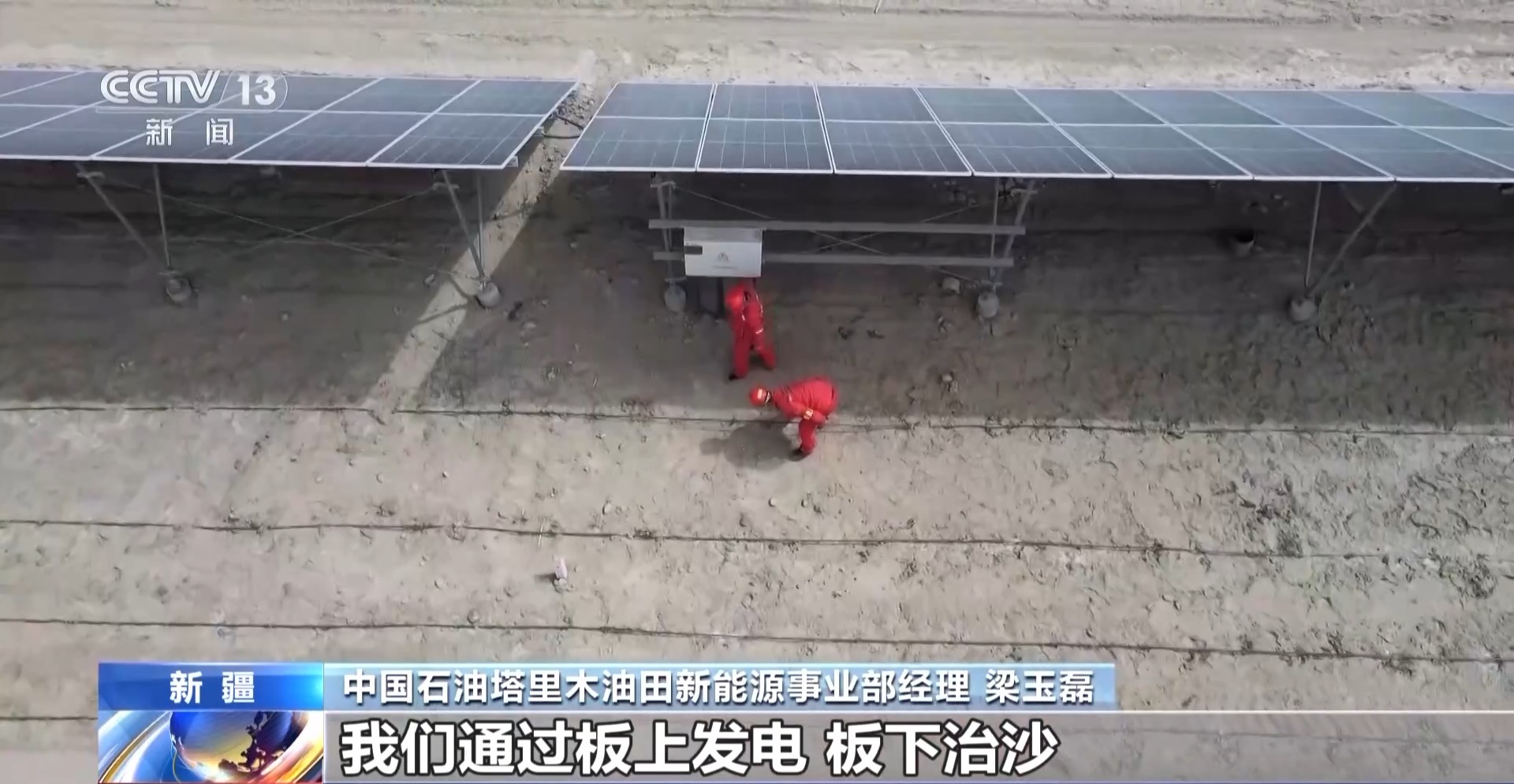 中國石油塔里木油田新能源事業(yè)部經(jīng)理 梁玉磊:我們通過板上發(fā)電、板下治沙,建設(shè)光伏方陣32個,固沙面積達到4000畝。有效改變了小環(huán)境風(fēng)速,形成“發(fā)電-固沙-惠民”一體模式。
