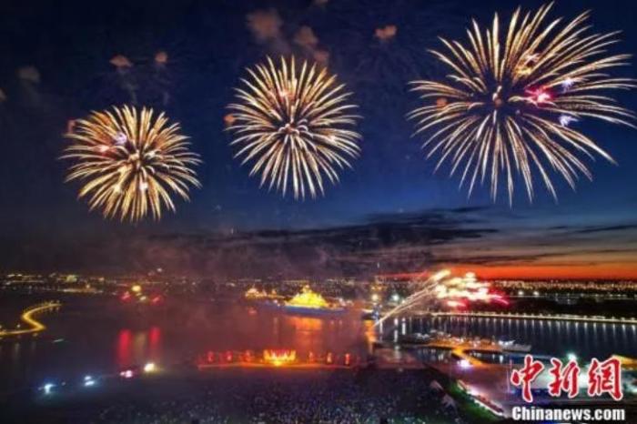 7月5日晚,“夜上津門·焰遇航母”大型沉浸式夏日音樂焰火秀在天津泰達航母主題公園上演。本次焰火秀以“煙花星球”為主題,吸引了許多市民和游客沉浸式體驗視聽盛宴。(無人機照片)中新社記者 佟郁 攝