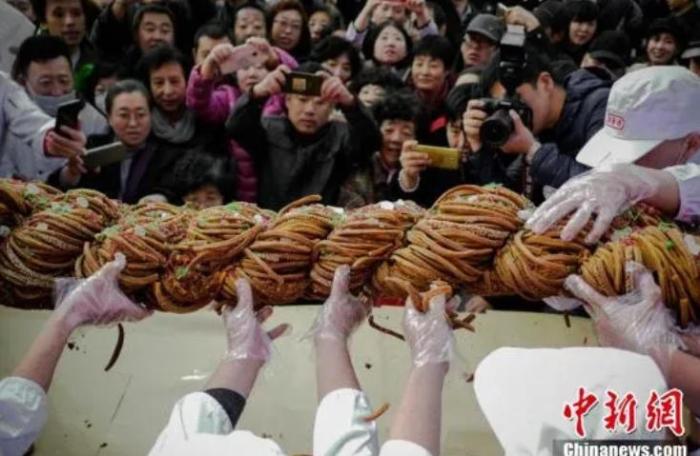 11月18日,天津麻花文化節(jié)在天津意式風(fēng)情街桂發(fā)祥十八街麻花體驗店舉行,消費者共同分享了一支重118斤的巨型麻花