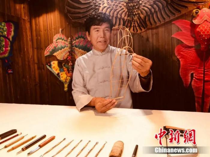 圖為國家級“非遺”項目“天津風(fēng)箏魏制作技藝”第四代傳承人魏國秋正在制作風(fēng)箏
