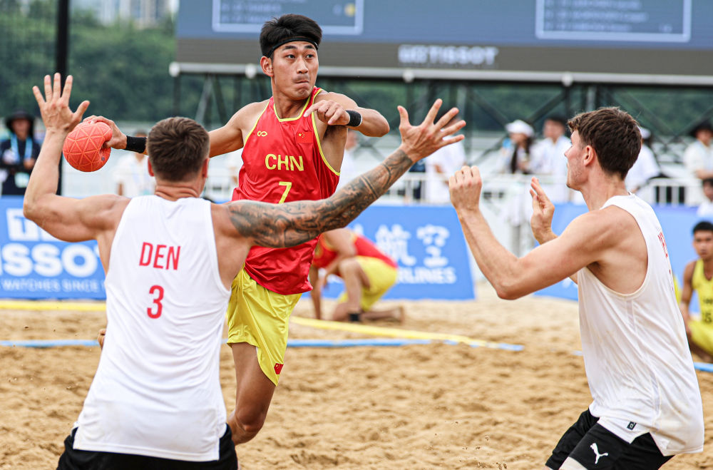 8月11日,中國隊球員任健豪(上)在比賽中進(jìn)攻。當(dāng)日,在2025年成都世運會沙灘手球男子第5-8名安慰賽半決賽中,中國隊0比2不敵丹麥隊。新華社記者 劉坤 攝