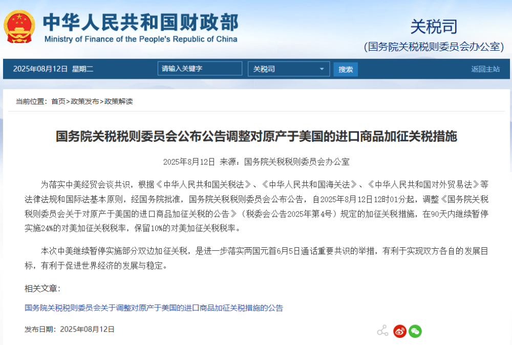 為落實(shí)中美經(jīng)貿(mào)會(huì)談共識(shí),根據(jù)《中華人民共和國(guó)關(guān)稅法》、《中華人民共和國(guó)海關(guān)法》、《中華人民共和國(guó)對(duì)外貿(mào)易法》等法律法規(guī)和國(guó)際法基本原則,經(jīng)國(guó)務(wù)院批準(zhǔn),國(guó)務(wù)院關(guān)稅稅則委員會(huì)公布公告,自2025年8月12日12時(shí)01分起,調(diào)整《國(guó)務(wù)院關(guān)稅稅則委員會(huì)關(guān)于對(duì)原產(chǎn)于美國(guó)的進(jìn)口商品加征關(guān)稅的公告》(稅委會(huì)公告2025年第4號(hào))規(guī)定的加征關(guān)稅措施,在90天內(nèi)繼續(xù)暫停實(shí)施24%的對(duì)美加征關(guān)稅稅率,保留10%的對(duì)美加征關(guān)稅稅率。