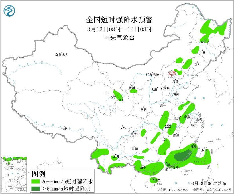 預(yù)計(jì),8月13日08時(shí)至14日08時(shí),黑龍江中部、吉林西部、遼寧西部、河南南部、湖北中部、江蘇北部、云南西部、廣東東部、福建東部和南部、西藏南部、臺(tái)灣島大部等地部分地區(qū)有大到暴雨,其中,福建東南部、廣東東南部、臺(tái)灣島東部和南部等地部分地區(qū)有大暴雨,臺(tái)灣島東部和南部等地局地特大暴雨(250~390毫米)。上述部分地區(qū)伴有短時(shí)強(qiáng)降水(最大小時(shí)降雨量20~50毫米,局地可超過70毫米),局地有雷暴大風(fēng)等強(qiáng)對(duì)流天氣。