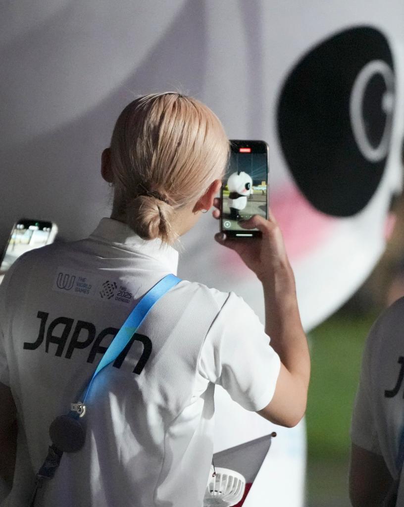 2025年8月7日,一名日本體育代表團(tuán)成員在開幕式上拍攝吉祥物“蜀寶”。當(dāng)日,第12屆世界運(yùn)動(dòng)會開幕式在成都舉行。新華社記者 胥冰潔 攝