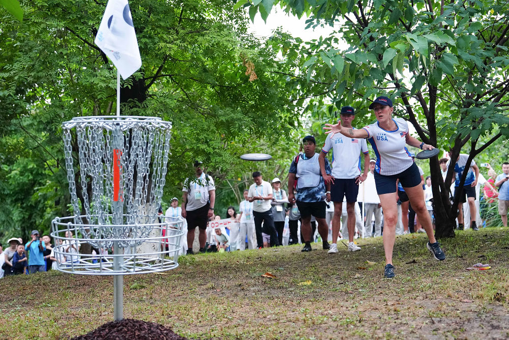 8月10日,美國擲準飛盤選手甘農(前)在比賽中。新華社記者 陳欣波 攝