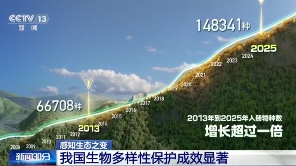 如今,《中國生物物種名錄》上“入冊”的生物種數(shù),從2013年的6.7萬種,增長到2025年的14.8萬種,增長超過1倍。近500種野生動(dòng)植物的受威脅等級出現(xiàn)下降。