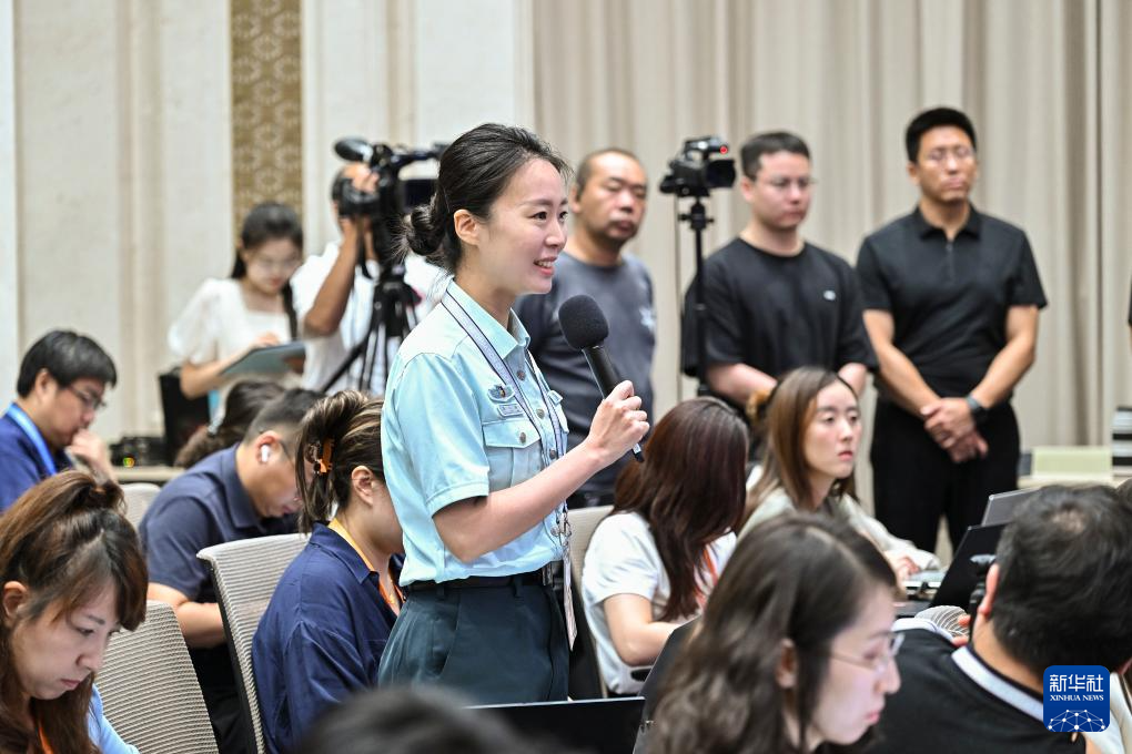 8月20日,國務院新聞辦公室在北京舉行新聞發(fā)布會,閱兵領導小組辦公室副主任、中央軍委聯(lián)合參謀部作戰(zhàn)局少將副局長吳澤棵,中國人民解放軍中部戰(zhàn)區(qū)閱兵指揮機構辦公室常務副主任、政治工作部少將副主任徐貴忠介紹閱兵準備工作有關情況,并答記者問。這是記者在現(xiàn)場提問。新華社記者 李鑫 攝