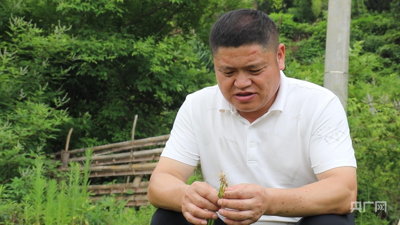鄭春模仔細觀察梯田秧苗生長情況(央廣網(wǎng)記者 王一凡 攝)