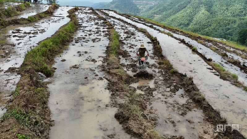 謝坪村的村民們正在梯田里打田(央廣網(wǎng)記者 郇康新 攝)