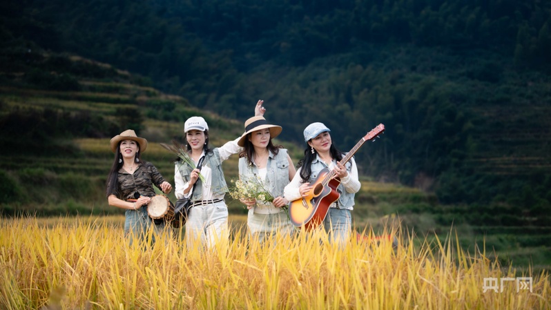 游客們手里的長槍短炮對準半山腰的梯田,咔嚓聲響個不停。航拍鏡頭下,沉甸甸的谷穗隨風(fēng)搖曳。幾名熱愛音樂的游客在梯田中央彈起吉他,驚飛成群白鷺,雪白的翅膀掠過湛藍晴空。