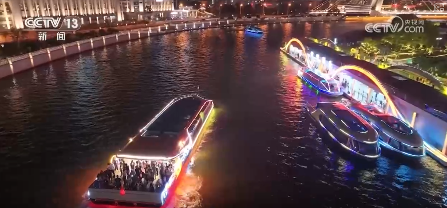 除了博物館內(nèi)的精品文物給大家?guī)砹宋幕⒀纾胍购蟮暮:予步k麗,海河之夜美景再升級(jí)。沿線建筑、橋梁及碼頭的燈光景觀全面提升,飽覽海河兩岸美景的海河游船也打造了全新體驗(yàn)。