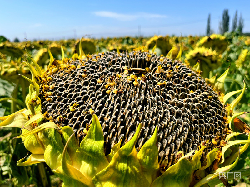 在這片萬(wàn)畝連片種植區(qū),種植戶王多寶正帶領(lǐng)工人切割葵盤、插桿晾曬?!敖衲晏鞖夂茫ㄩL(zhǎng)勢(shì)特別旺,籽粒又大又亮,產(chǎn)量肯定差不了?!北M管汗水浸濕衣衫,喜悅卻洋溢在他的臉龐。