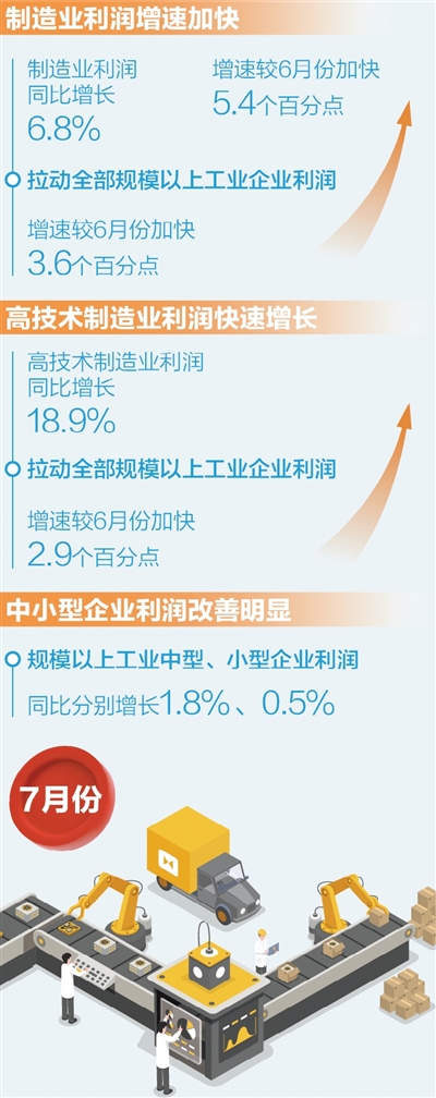 高技術(shù)制造業(yè)利潤快速增長,引領(lǐng)作用明顯。7月份,高技術(shù)制造業(yè)利潤由6月份下降0.9%轉(zhuǎn)為增長18.9%,拉動全部規(guī)模以上工業(yè)企業(yè)利潤增速較6月份加快2.9個百分點,引領(lǐng)作用明顯。其中,航空航天器及設(shè)備制造行業(yè)利潤增長40.9%,生物藥品制造、化學(xué)藥品制劑制造等行業(yè)利潤分別增長36.3%、6.9%。