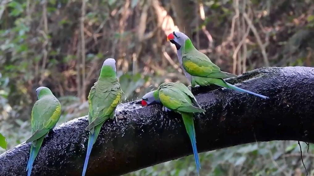 近日,在云南省普洱市思茅區(qū)思茅港鎮(zhèn)茨竹林村芒壩村民小組,成群的國家二級保護(hù)動物大紫胸鸚鵡飛臨村子周圍的榕樹嬉戲。