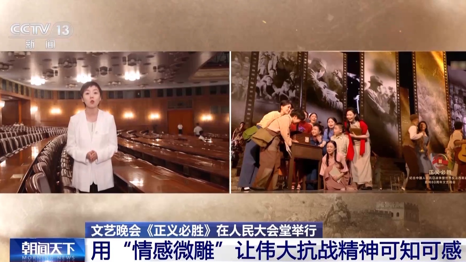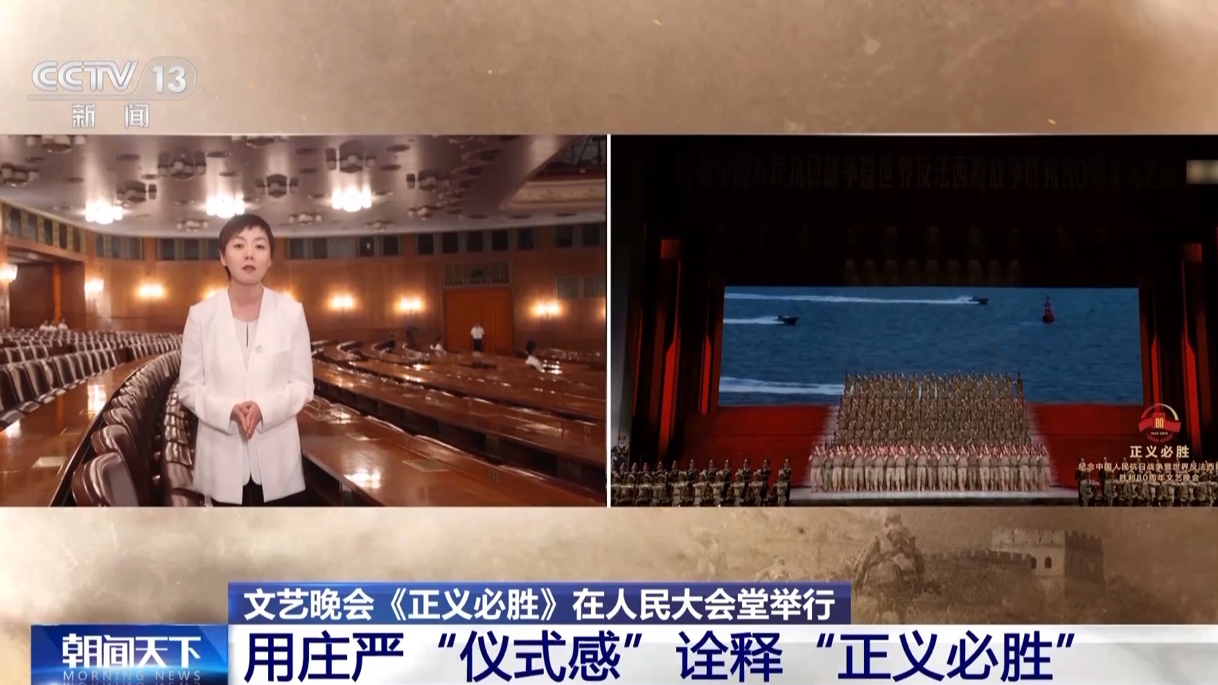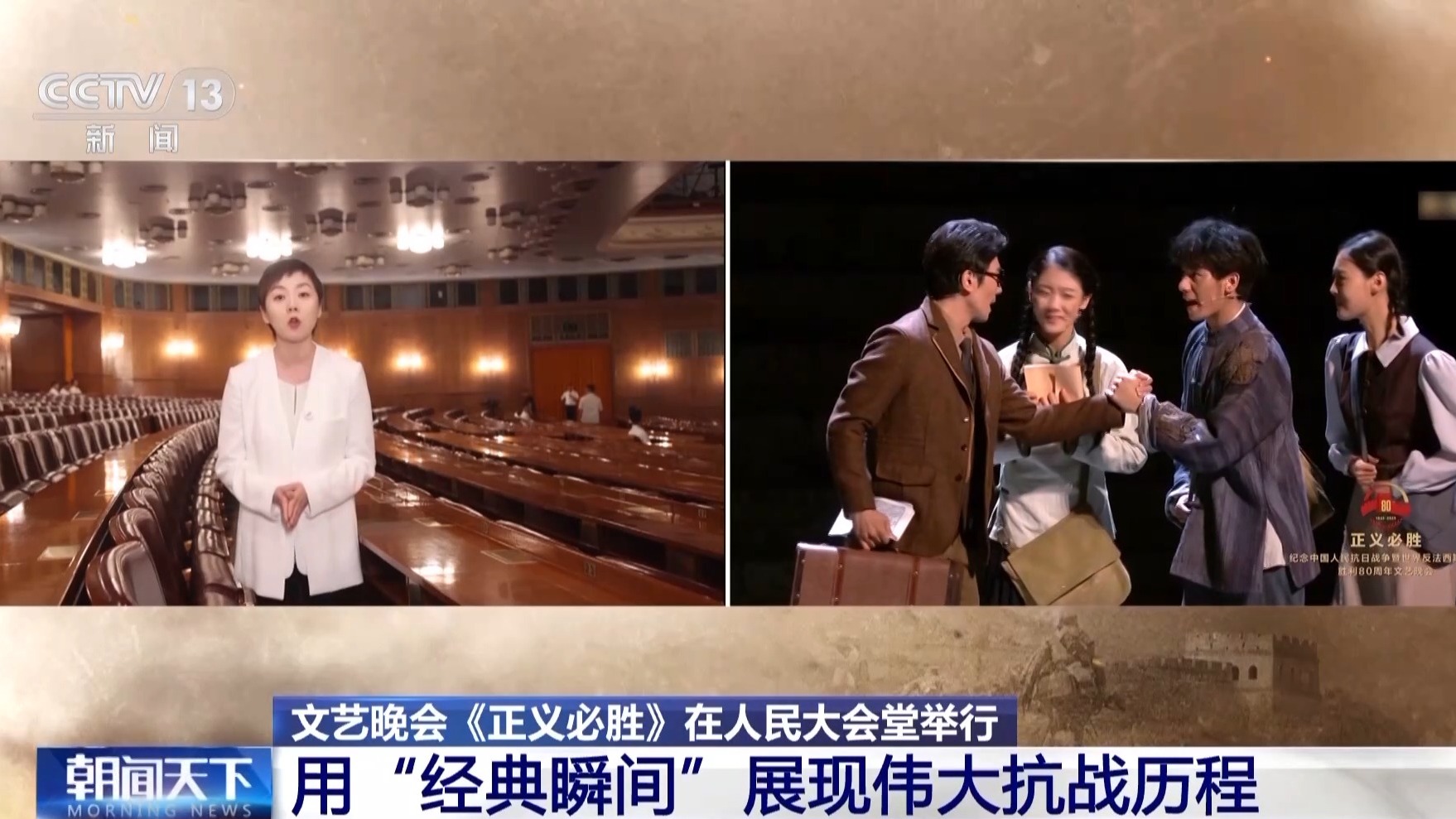 3日晚,紀念中國人民抗日戰(zhàn)爭暨世界反法西斯戰(zhàn)爭勝利80周年文藝晚會《正義必勝》在人民大會堂舉行。