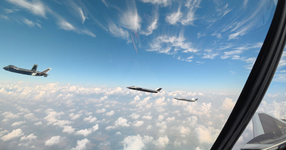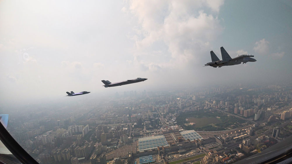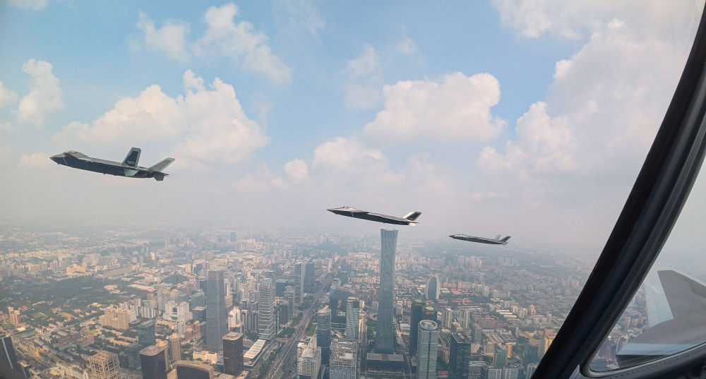 ↑這是殲擊機梯隊從北京城區(qū)上空飛過。