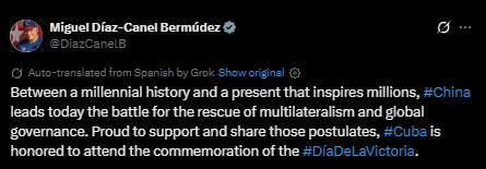 迪亞斯-卡內(nèi)爾在社交媒體上發(fā)文稱,“在綿延千年的歷史與激勵億萬人的當下之間,中國今日引領(lǐng)捍衛(wèi)多邊主義與全球治理的斗爭。古巴為支持并踐行這些理念而自豪,并榮幸出席勝利日紀念活動?!?/p>