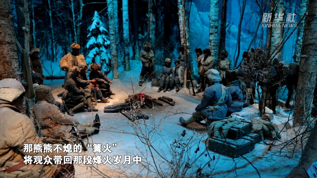 “九·一八”歷史博物館內(nèi),抗聯(lián)戰(zhàn)士密林宿營(yíng)地的模擬場(chǎng)景吸引觀眾駐足,那熊熊不熄的“篝火”,將觀眾帶回那段烽火歲月中。