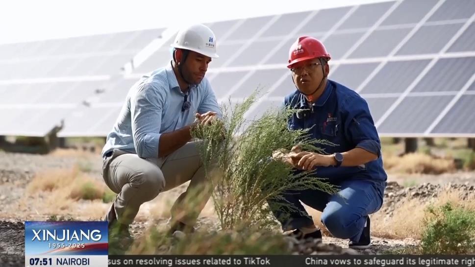 外籍主持人林肯探訪了全球最大的“草光互補”光伏基地——阿合雅光伏產(chǎn)業(yè)園。這片由181萬塊光伏板組成的藍色海洋,占地493公頃,相當于700個標準足球場。不僅能夠提供滿足約43萬人全年用電需求,還兼具治沙功效。中國華能集團烏什光伏電站負責人周博表示,這類光伏設施能夠穩(wěn)固土壤、防止侵蝕,板面凝結的水珠還可灌溉下方土地,支持植物持續(xù)生長?!案瓯谄孥E”的背后,是國家實現(xiàn)“雙碳”目標而推動的生態(tài)與能源的“雙向奔赴”。