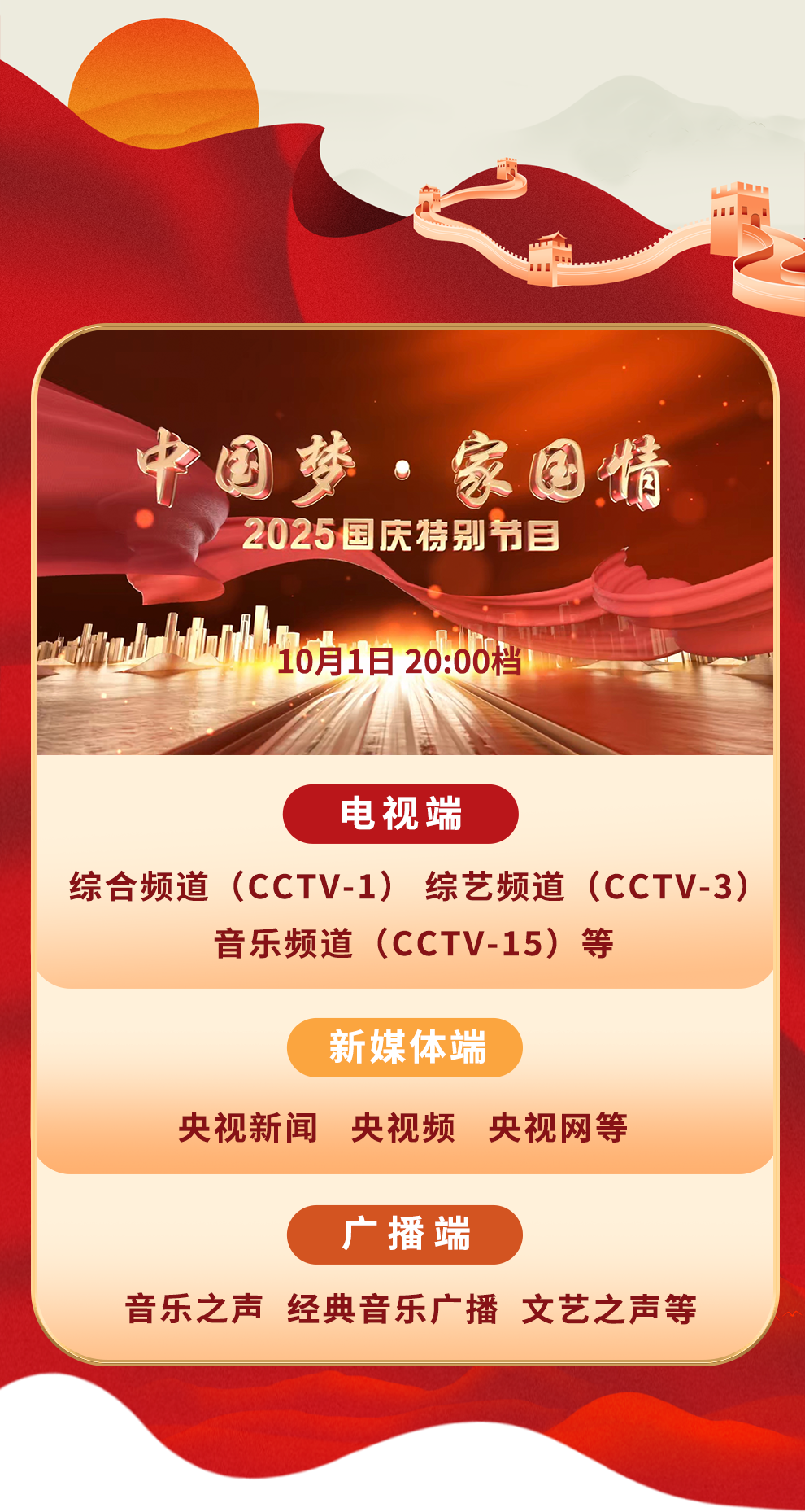 金秋潑彩山河醉,家國同輝氣象新。10月1日晚八點,《中國夢 家國情——2025國慶特別節(jié)目》將在《我愛你中國》的大合唱中拉開大幕。特別節(jié)目走進城市地標與文化遺址,展現山河新貌與奮斗者群像。經典曲目、交響合唱、新創(chuàng)歌曲傳遞濃濃家國情懷??箲?zhàn)老兵、奧運冠軍、各行各業(yè)奮斗者深情講述……整場節(jié)目,洋溢著中華民族偉大復興勢不可擋的壯志豪情。