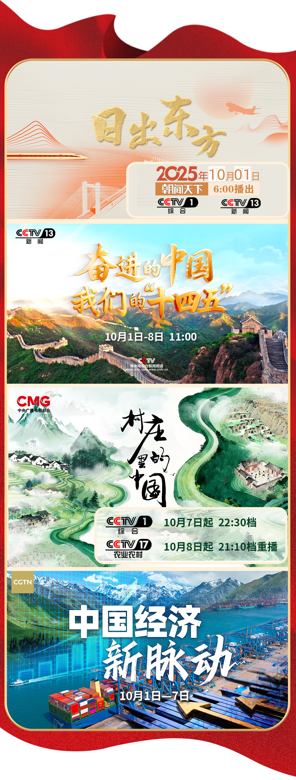 新時代中國的動人故事里,主角正是新征程上奮進的你我。在雄壯的國歌聲中,跟隨特別報道《日出東方》,領略祖國山川的壯麗秀美,看晨曦中的中國人奮力拼搏的“此時此刻”。直播特別節(jié)目《奮進的中國 我們的“十四五”》《向祖國報告》《團結奮斗向復興》,全景展示中國式現代化建設成就。走進《村莊里的中國》飽覽鄉(xiāng)村振興和美畫卷,走遍《可愛的中國》感受身邊的美好生活。走出國門,在全球化視野中,觸摸《中國經濟新脈動》。