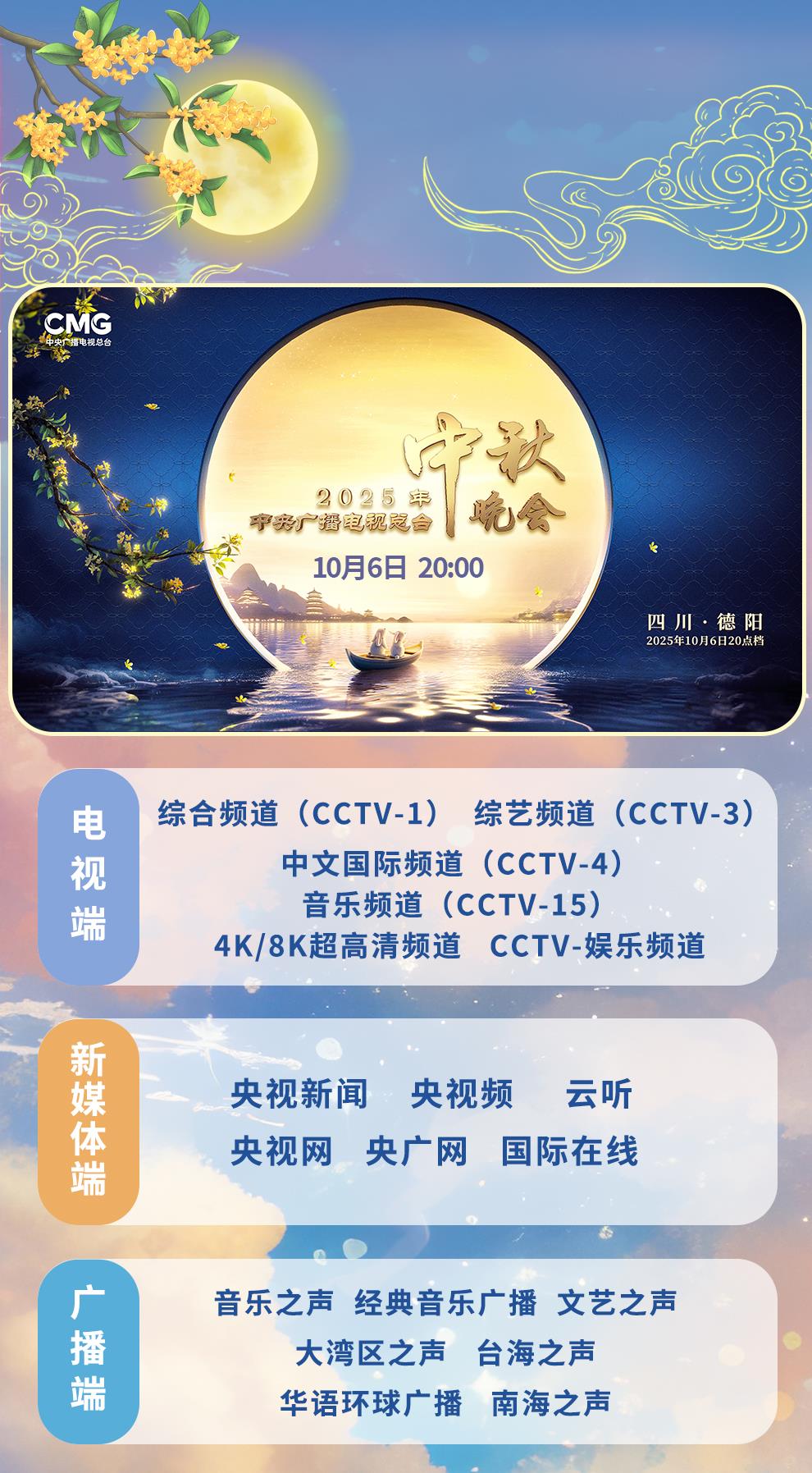 月照古今,共敘團圓。《中央廣播電視總臺2025年中秋晚會》主舞臺選址四川德陽玄珠湖,以蜀道、明月、山水營造“月從蜀道升,人向鏡中圓”的唯美意境?!渡皆聺M》《是吾鄉(xiāng)》《一輪秋》三個篇章,創(chuàng)新視聽語言呈現三星堆的神秘古韻、智能制造的硬核力量、非遺樂器的悠遠回響,為全球受眾奉獻一場巴蜀大地文化與中秋團圓意蘊交織相融的“團圓盛宴”。央視新聞、央視頻推出“秋晚探班”相關產品,帶你“打卡”錄制現場,“解鎖”臺前幕后。