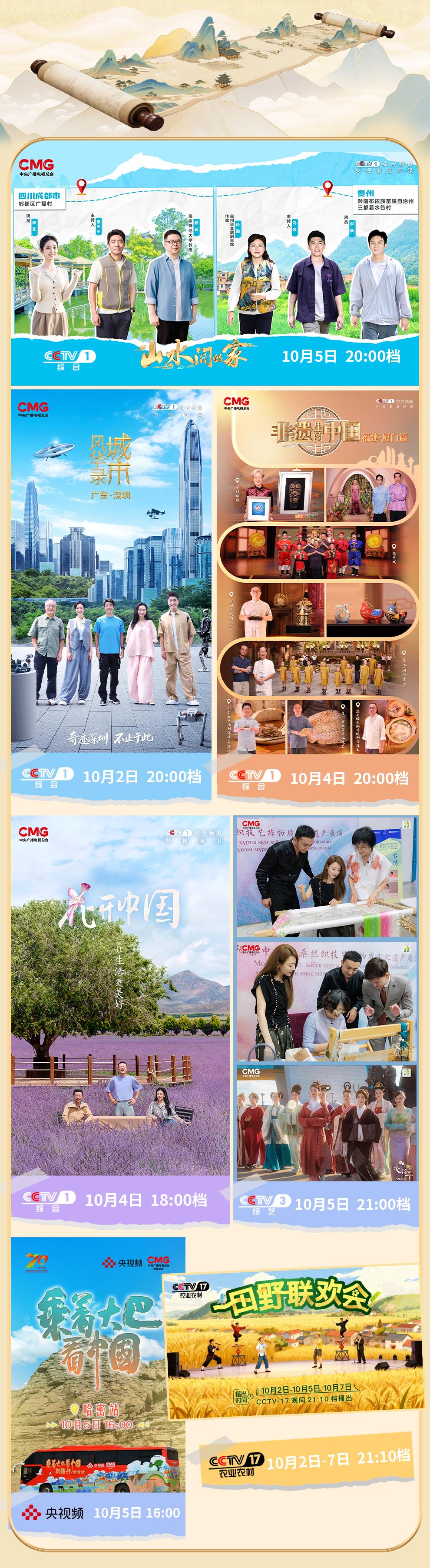 八天假期,想好去哪兒玩了嗎?來,跟著總臺去打卡!頭兩站:四川、貴州!《山水間的家(第四季)》“山水小分隊”邀你在川西林盤探韭香產業(yè),在黔南山鄉(xiāng)看巖椒成林。第三站:廣東。《城市風華錄》帶你去深圳探訪全球首家機器人6S店,感受“奇跡之城”向新向好的澎湃動力。第四站:福建。珠繡、漆線雕、閩南童謠、高甲戲……看《非遺里的中國》,領略廈門非遺之美。第五站:新疆。從《花開中國》開啟一場跨越天山的芬芳之旅,在《衣錦天下 絲路季》發(fā)現絲綢之路上的中國審美,《乘著大巴游中國》探尋哈密甜美密碼。第六站:內蒙古。在通遼參加《田野聯歡會》,體驗鄉(xiāng)土文化新活力。這八天的旅程,你不會錯過雄奇的風光、古老的文化、新奇的創(chuàng)造,還有熱氣騰騰的生活。