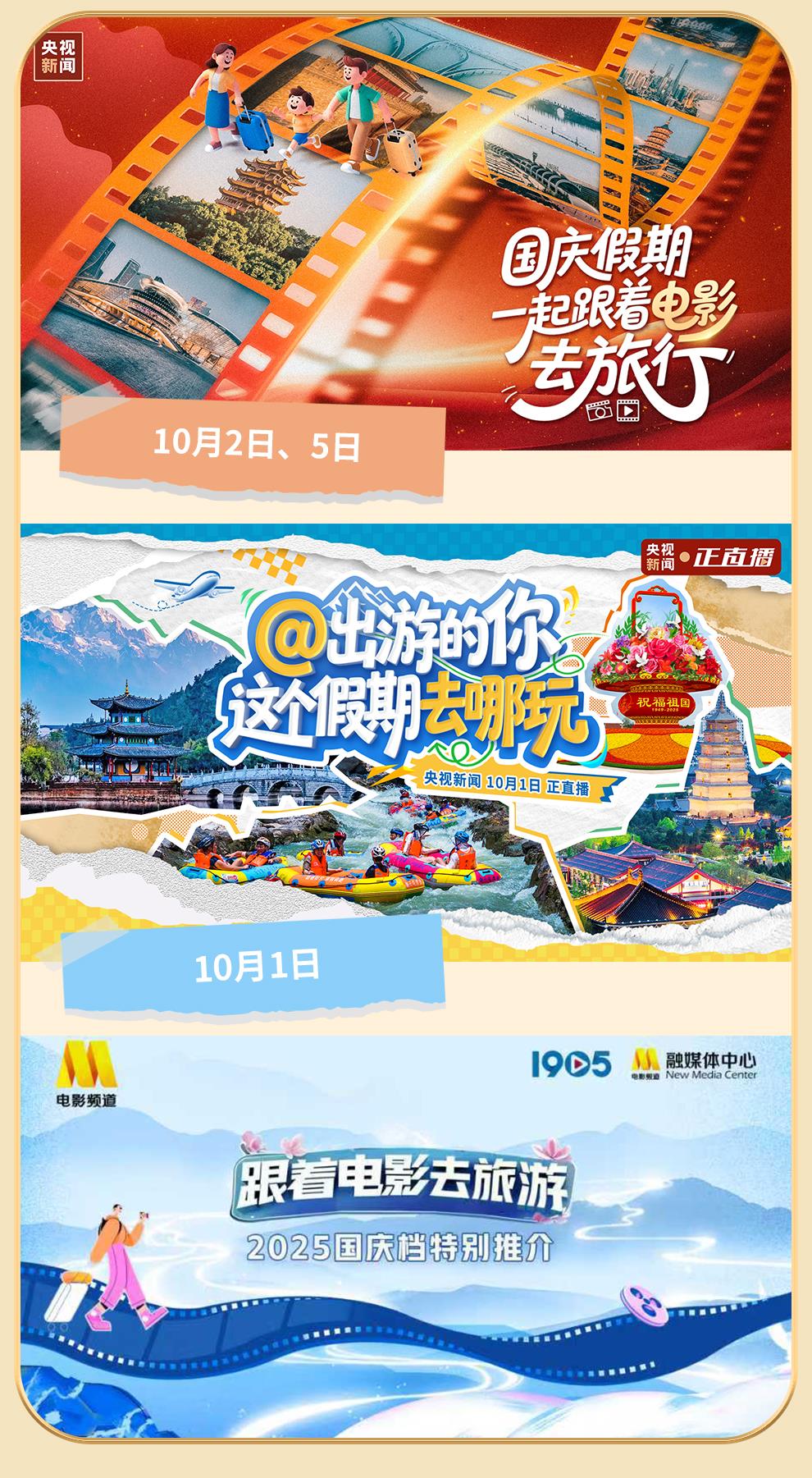 《國慶假期 一起跟著電影去旅行》《@出游的你 這個假期去哪玩?》還為大家策劃了第七站、第八站……準備好出發(fā)了嗎?