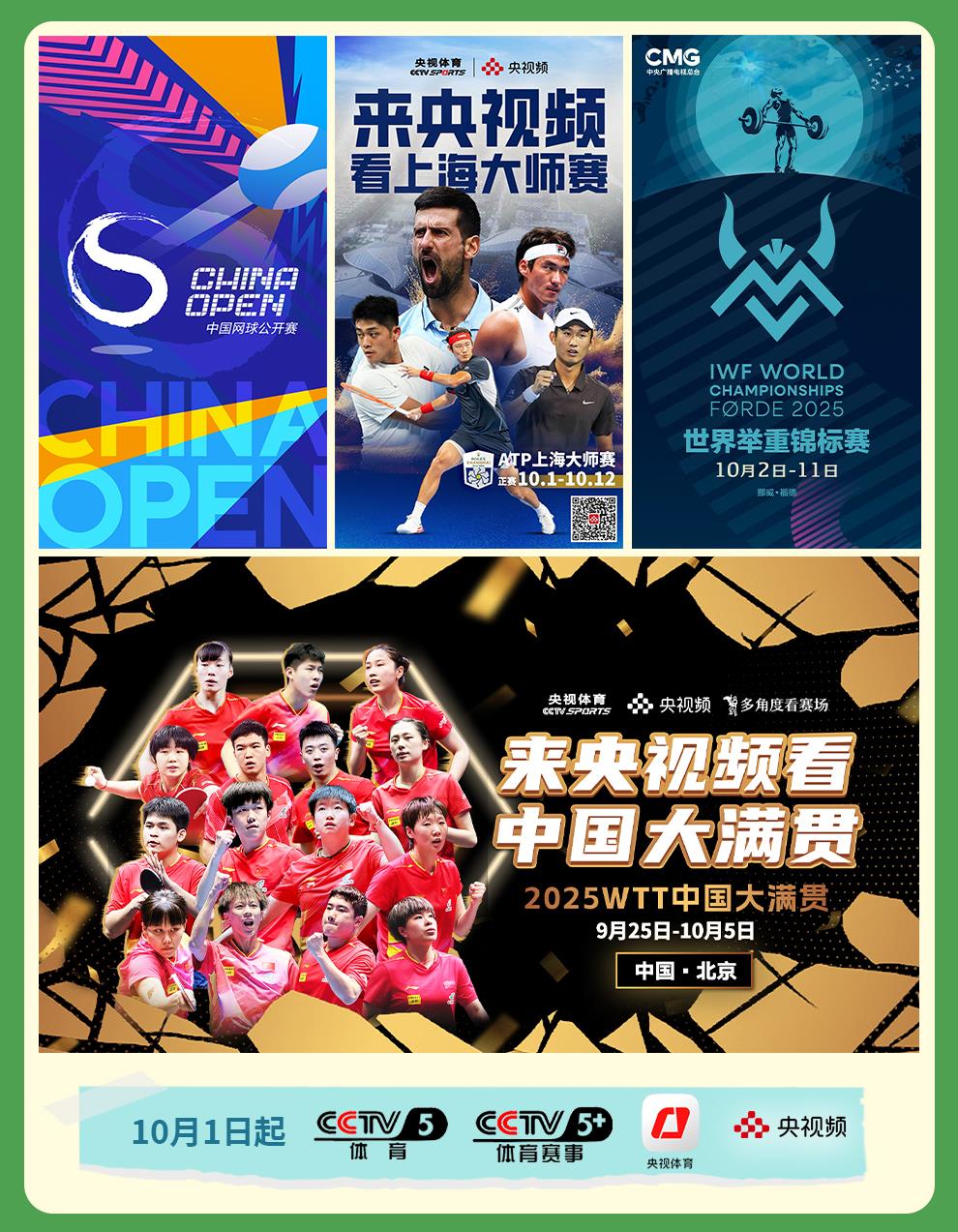 精彩賽事,激情無限!《2025年中國網球公開賽》《2025年世乒聯大滿貫賽(中國站)》《2025年ATP1000男子網球大師賽(上海賽)》《2025年世界舉重錦標賽》等黃金賽事接連開賽,讓體育迷暢享運動的無窮魅力。