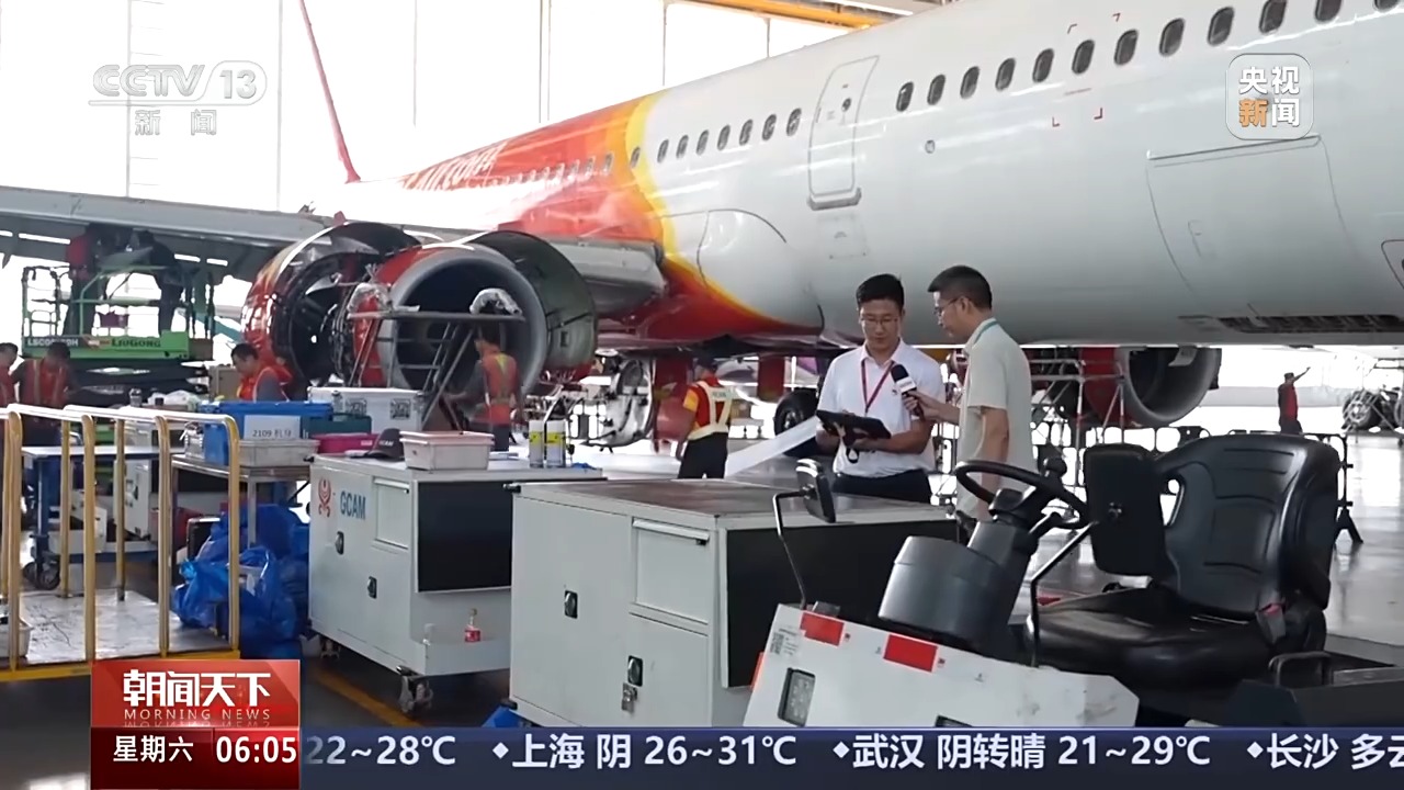 一站式飛機(jī)維修產(chǎn)業(yè)基地副總監(jiān) 楊文博:我們現(xiàn)在看到的這架是來自泰國的,這里兩架越南的,機(jī)坪上也有等待進(jìn)機(jī)庫進(jìn)行維修的一架境外飛機(jī)。我們今年上半年的境外維修飛機(jī)的數(shù)量已經(jīng)接近于去年一年的量了?,F(xiàn)在每條線位都已經(jīng)是滿的了,一直要持續(xù)到2026年11月底。