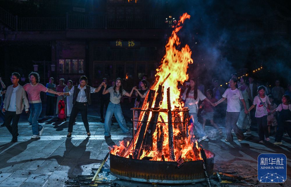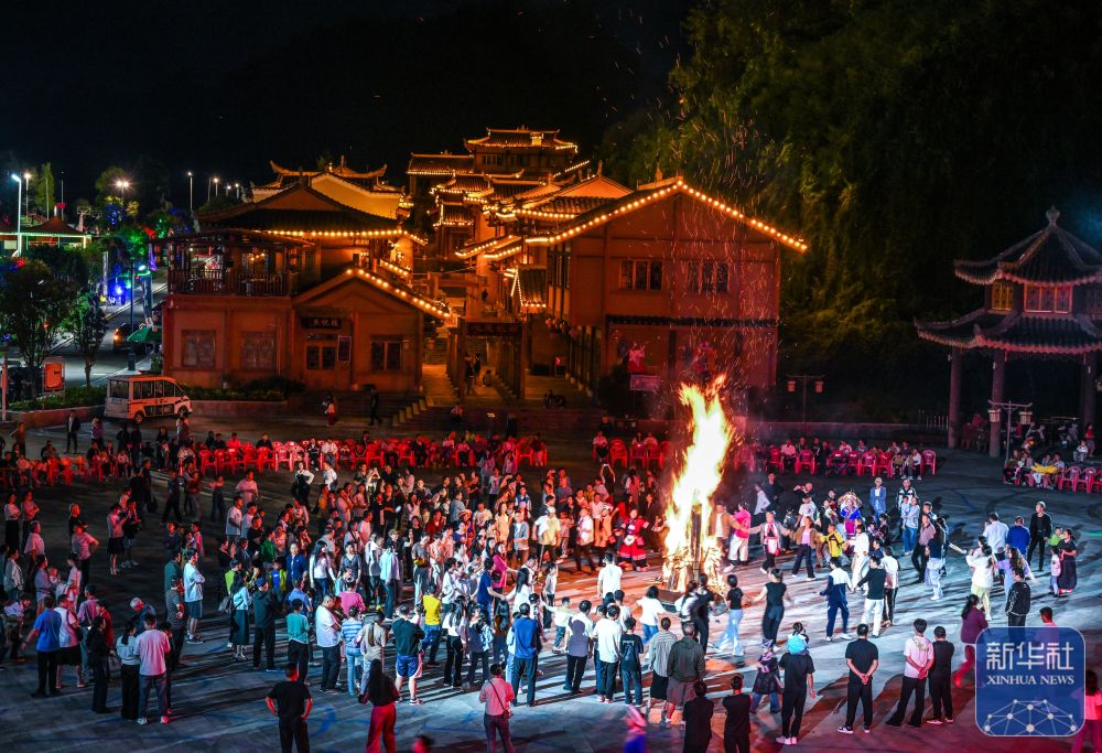 ↑ 10月5日晚,在貴州省晴隆縣阿妹戚托小鎮(zhèn),游客與當?shù)厝罕妵艋鸸参?。新華社記者 楊文斌 攝