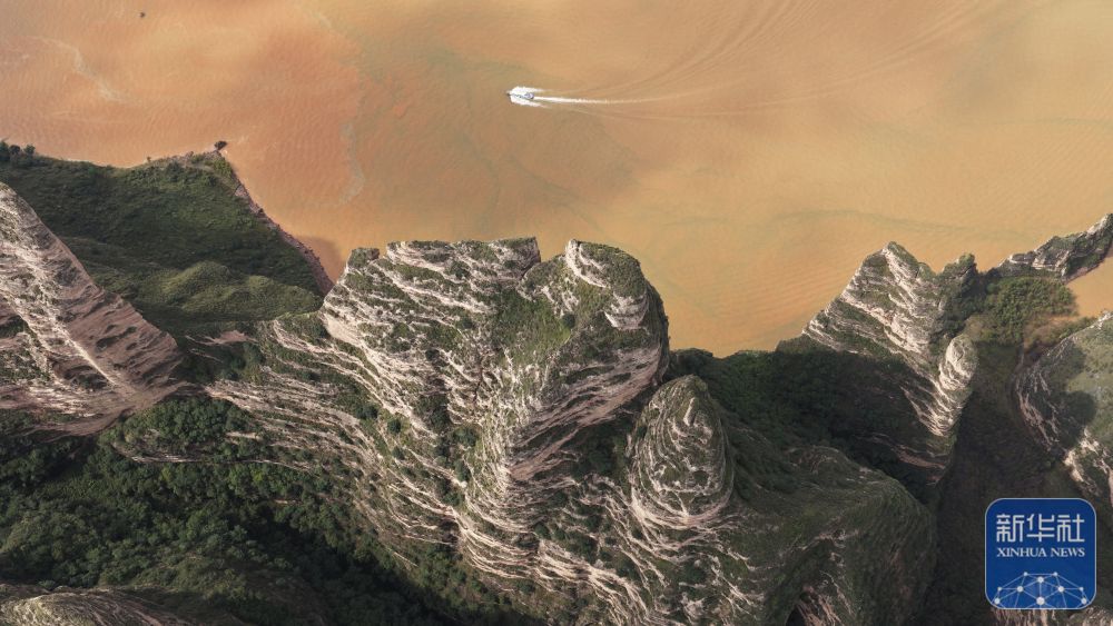 ↑ 10月6日,游客乘船在甘肅炳靈丹霞國家地質(zhì)公園游覽(無人機照片)。新華社發(fā)(史有東攝)