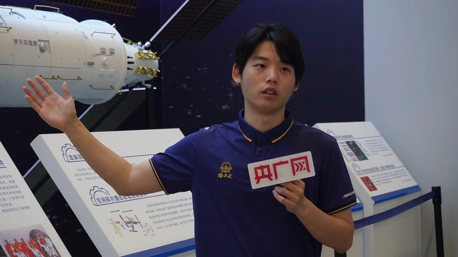 學(xué)生講解員郭鎮(zhèn)宇介紹由哈工大參與研制的問(wèn)天實(shí)驗(yàn)艙小機(jī)械臂(央廣網(wǎng)發(fā) 王語(yǔ)詩(shī) 攝)