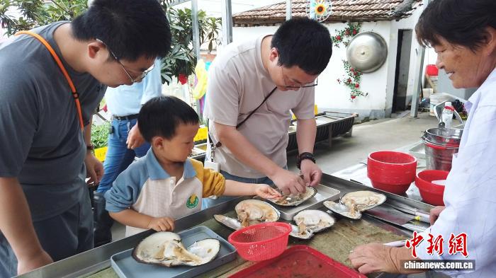2025年6月,家長與孩子正在進行開蚌取珠體驗。曹丹 攝