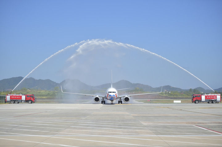 2025年9月28日,由中國國際航空?qǐng)?zhí)飛的北京大興至瑞金航班飛抵瑞金機(jī)場(chǎng)后通過“水門”。新華社發(fā)(楊鑫 攝)