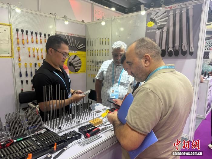 10月16日,第138屆中國(guó)進(jìn)出口商品交易會(huì)(廣交會(huì))正在廣州舉行,境外采購(gòu)商在臺(tái)商展位前詢盤。 中新社記者 蔡敏婕 攝