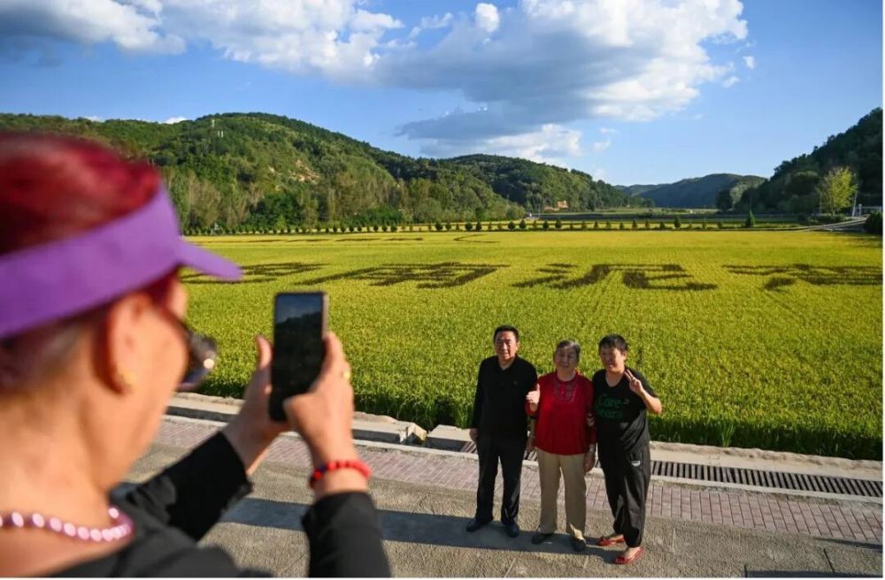 游客在南泥灣的稻田前留影。新華社記者 鄒競(jìng)一 攝