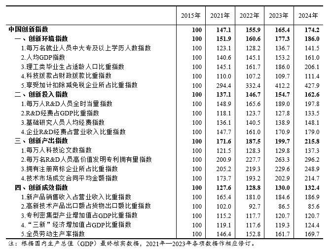 根據(jù)國家統(tǒng)計(jì)局社科文司《中國創(chuàng)新指數(shù)研究》課題組測算,2024年中國創(chuàng)新指數(shù)為174.2(以2015年為100),比上年增長5.3%[1]。分領(lǐng)域看,創(chuàng)新環(huán)境指數(shù)、創(chuàng)新投入指數(shù)、創(chuàng)新產(chǎn)出指數(shù)和創(chuàng)新成效指數(shù)分別為186.0、162.6、215.8和132.4,分別比上年增長4.9%、5.1%、8.1%和1.9%。結(jié)果表明,2024年中國創(chuàng)新指數(shù)保持穩(wěn)步增長,我國科技創(chuàng)新能力持續(xù)提升,創(chuàng)新產(chǎn)出較快增長,發(fā)展新動(dòng)能不斷壯大,為經(jīng)濟(jì)高質(zhì)量發(fā)展提供有力支撐。