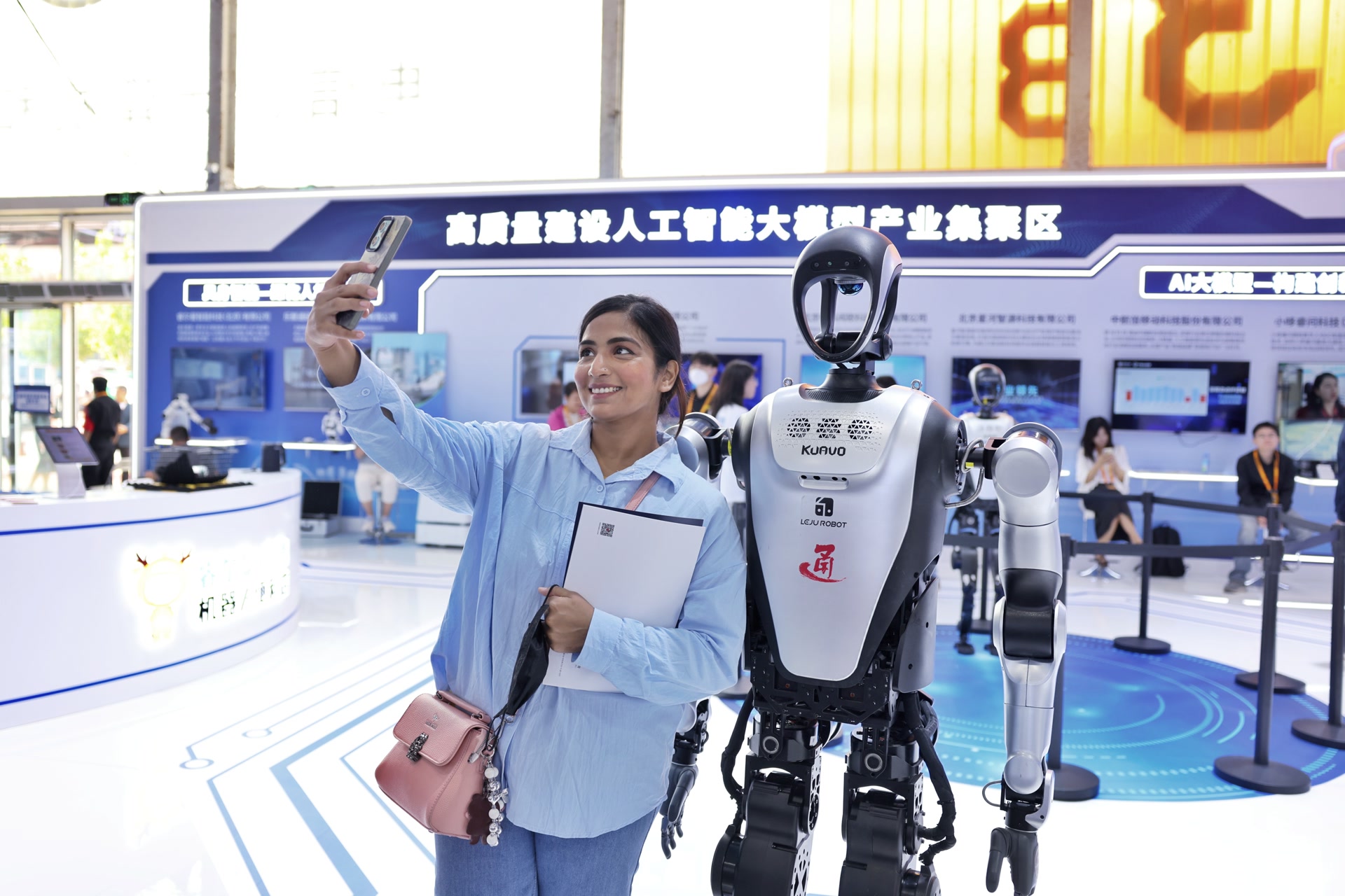 服貿(mào)會(huì)上,外國(guó)觀眾與機(jī)器人合影。 潘之望 攝