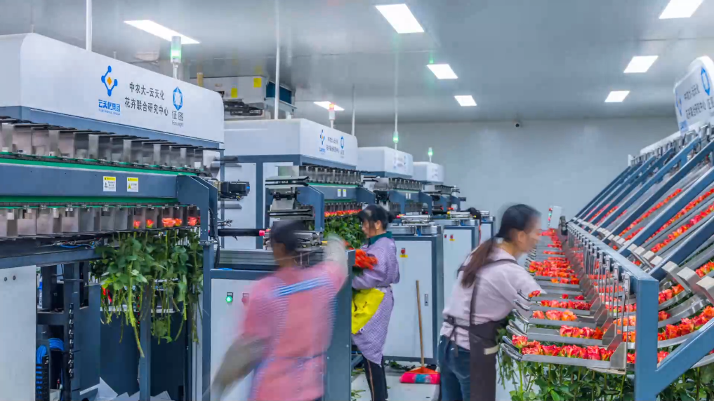 花卉大棚“智慧大腦”中央控制系統(tǒng)實(shí)時監(jiān)測與調(diào)控各類環(huán)境指標(biāo);智慧檢測控制水肥一體化循環(huán)系統(tǒng)確保植株健康生長;采后處理中心紅外成像識別系統(tǒng)實(shí)現(xiàn)自動分級分類,自動捆扎與包裝。