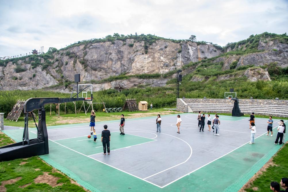 2025年8月16日,在重慶市北碚區(qū)靜觀鎮(zhèn)中華村,游客在礦坑修復改造的運動場內(nèi)打球。新華社記者 唐奕 攝