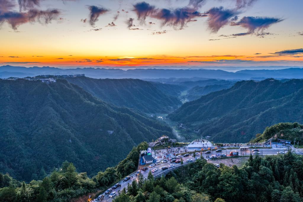 2025年8月20日,游客在重慶市石柱縣黃水鎮(zhèn)環(huán)湖路觀景臺欣賞晚霞景色(無人機照片)。新華社記者 唐奕 攝